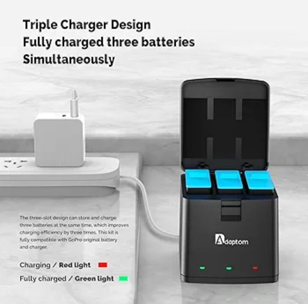 برای گوپرو هیرو ۱۱/۱۰/۹ - شارژر باتری Adaptom gopro hero 11 10 9 همراه با سفر هیجانانگیز شما. بسته شامل: ۳ باتری Adaptom Hero 11/10/9، ۱ شارژر سریع USB، 1 کابل type.c
