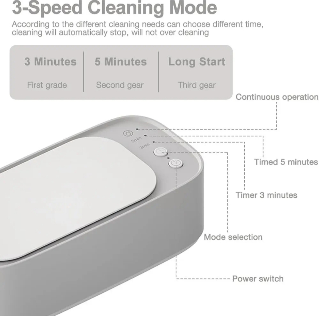 ۳ چرخه تمیز کردن قابل تنظیم دستگاه تمیز کننده اولتراسونیک دارای ۳ چرخه تمیز کردن (۱۸۰، ۳۰۰ و طولانی مدت) است. زمان تمیز کردن را میتوان به صورت جداگانه در صورت نیاز تنظیم کرد. بنابراین شما حداکثر کنترل را بر تمیز کردن جواهرات، عینک و سایر اقلام خود دارید.
