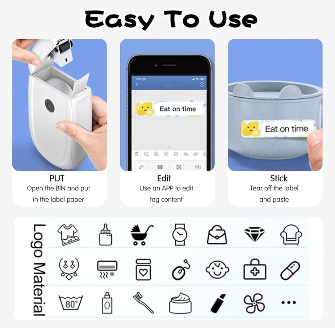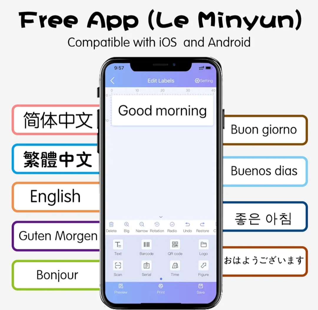 ★ اتصال بیسیم بلوتوث: سازگار با iOS و اندروید، برنامه دانلود مستقیم کد اسکن "Yue minyun"، که شامل یک کتابخانه سختافزاری بزرگ، انواع فونتها، حالت ویرایش متن، ۱۰ زبان قابل تغییر آزادانه، شما میتوانید سبک برچسب و فونت مورد نظر خود را انتخاب کنید.