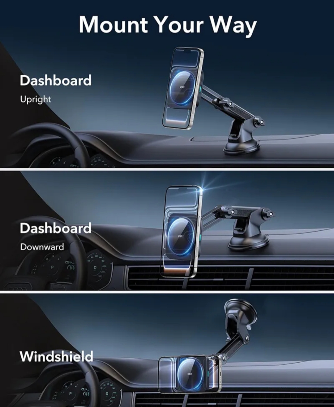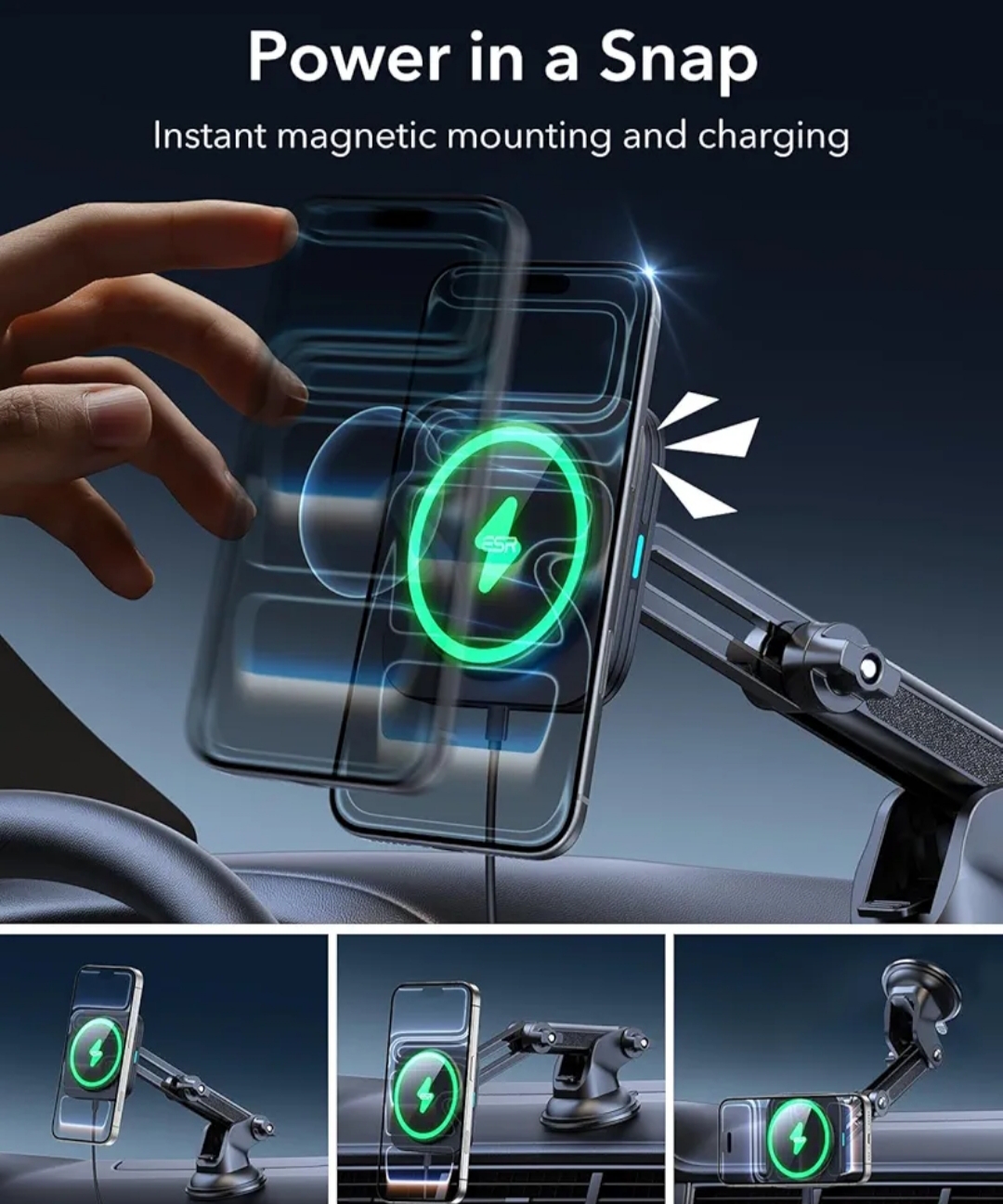 ترکیب نگهدارنده مغناطیسی + شارژر بیسیم باعث میشود هم گوشی در خودرو روی داشبورد ثابت بماند و هم شارژ شود، مناسب برای استفاده با GPS حین رانندگی.