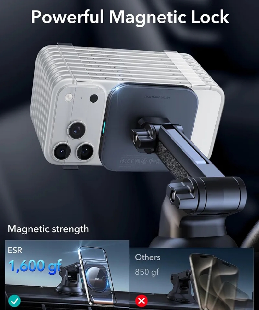 نگهداری گوشی در مسیرهای ناهموار مگنت قوی + حلقه سیلیکونی ضد لغزش — طبق سایت سازنده تا 1,600 g نیروی نگهدارنده دارد؛ با کیس MagSafe یا کیس ESR استحکام بیشتر تضمین میشود.